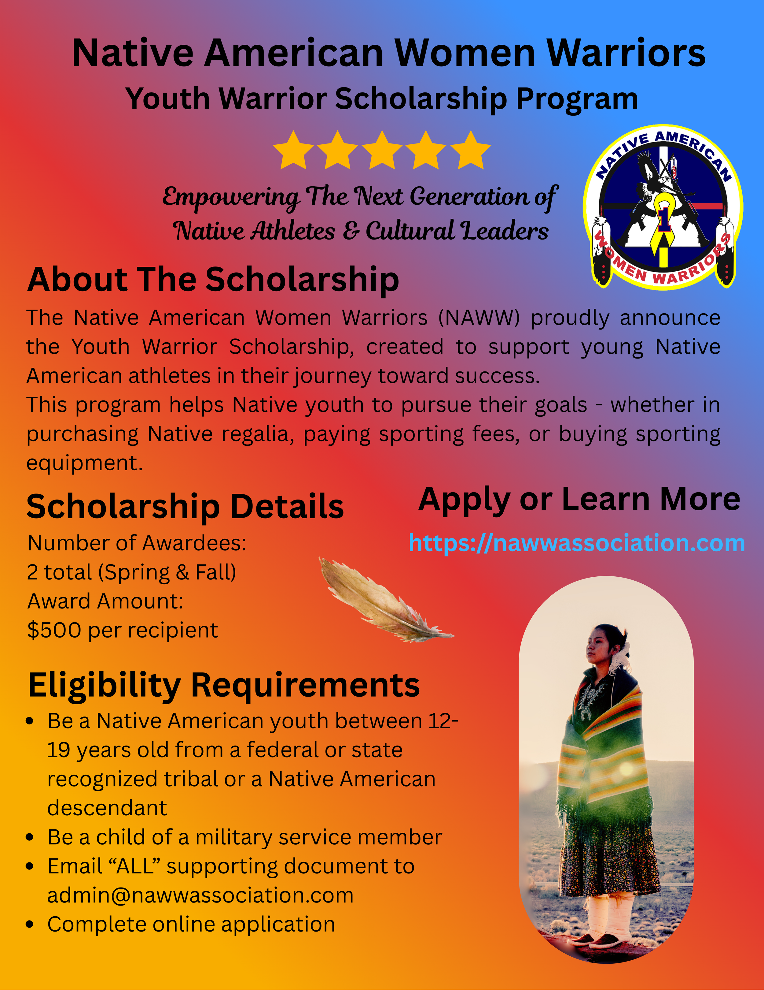 Native American Women Warriors (NAWW) is proud to support the next generation of leaders through two exciting scholarship opportunities! The NAWW Warrior Youth Scholarship uplifts young Native students pursuing their dreams, while the NAWW Educational Scholarship assists those furthering their education and career goals. These scholarships honor the resilience, strength, and dedication of Native communities by investing in their future.